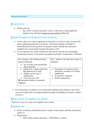 Employment Law notes from the 2024 February Intensive period. With a track record of achieving full marks in the mid-term assessment and an H1 grade in the final exam, you can rely on the organization of these notes to effectively address hypothetical questions and excel in your studies. Content cover: 1. The Scope and Purpose of Employment Law 2. Defining the Concept of 'Employment' 3. The Regulation of Employment via Contract Law 4. Fair Work Act - An Introduction 5. Fair Work Act - Minimum Standards 6. Fair Work Act - Collective Bargaining and Enterprise Agreements 7. Fair Work Act - General Protections and Unfair Dismissal 8. Enforcement and 9. Work Health & Safety Regulation 10. Current & Future Challenges for Work Regulation 11. Anti-discrimination law 12. Fair Work Act - adverse action (General Protections) 13. Fair Work Act – anti-bullying orders and sexual harassment claim