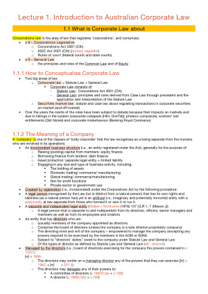 Notes + Scaffold + Cases --> Everything you need to get HD! Topics include - corporate formation and the consequences of the company as an entity with its own personality - regulating the internal functioning of companies including the operation of the company's constitution - the role and duties of corporate directors to the company and its members - the rights and remedies available to shareholders to protect their investment - the authority of corporate officers and the responsibility of companies to outsiders for their actions - financing the company's operations through debt and equity - the external administration of companies in financial distress - winding up and deregistering companies, and regulating on-market and off-market transactions in corporate securities