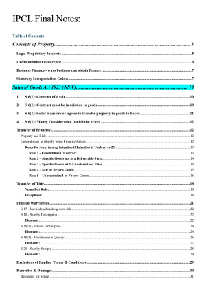Guaranteed the BEST set of EXTREMELY ORGANISED NOTES that cover all the topics in IPCL you need to get a high distinction in the final multiple choise exam. I promise these notes will NOT disappoint and are DEFINITELY worth the price. These notes include: - a step-by-step guide on how to address each element in each topic for the exam - extensive case summaries for each topic that cover all the required cases and beyond to distinguish you from others - highlighted key phrases for easy access during the exam - table of contents for easy access to each topic during the exam You can see all the topics covered from the contents page in the sample notes. Enjoy and goodluck!! :)))