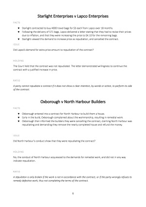 Case summaries provided for all required pre-readings. Facts are expressed simply but with all information provided to ensure it is easy to understand. Ratios are extrapolated in simple English. Full exam notes and a cheaper bundle containing exam notes and case summaries are also available. Search "LAWS1702 Law of Contracts II Exam Notes" or "LAWS1702 Law of Contracts II Exam Notes and Case Summaries" Topics include: Topics include: - Discharge by performance - Repudiation - Breach - Express or implied essentiality - Election - Termination - Specific performance - Injunctions - Equitable Damages - Theory of Damages - Assessment of Damages - Limits on Damages - Complications in Assessment - Penalties - Recission - Vitiating Factors - Misrepresentation - Misleading or Deceptive Conduct - Duress - Undue Imfluence - Unconscionable Dealing - Statutory Unconscionability - Third Party Impropriety