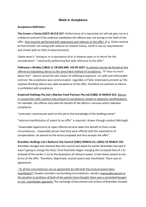 These LLB1120 notes are very detailed explanations of the law of contract- it focuses on each relevant case, providing numerous important points. The notes cover all the LLB 1120 course content to a High Distinction level. I used these perfectly summarised, refined and double-checked notes to achieve a High Distinction (85) in the LLB 1120 final exam- achieving an overall course mark of 82. This exam result placed me in the top 2-3% of all LLB students. These notes offer case, legislation and international instrument citations in an easy-to-understand format. This includes lists, diagrams and headings. Topics covered include: * Offer * Revocation, rejection, lapse of Offer * Acceptance of offer, including communication of acceptance * Consideration * Intention to create legal relations * Certainty, completeness and illusory promises * Formalities and part performance * Capacity * Privity * Alternative remedies, including part performance, constructive trusts, estoppel, unconscionable conduct, restitution, quantum meruit