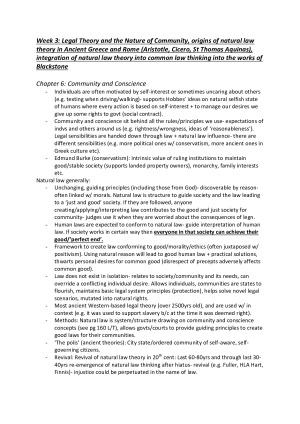 These extremely detailed notes assisted me achieving my highest final subject mark of my law degree - an 88. Jurisprudence requires a unique method of thinking to achieve in the subject; I feel these notes articulate the appropriate theories in an easy-to-understand manner. These notes contain information relevant to both essay-style and problem-style examination questions, and are sorted clearly by both the theories and theorists themselves. Topics included are: 1. Scope and Purpose of Legal Theory 2. Legal Theory as a Practice of Law 3. Legal Theory and the Nature of Community (Aristotle, Cicero, St Thomas Aquinas) 4. Theorists- Hobbes, Locke, Fuller, Liberalism etc 5. Legal positivism- Hart, Bentham, Austin 6. Marx, Durkheim, Weber, The Crits 7. Pound, The American Legal Realists, Holmes, Realist Manifesto, Llewellyn, Frank 8. Identifying views of judges 9. Post-modernism, post-structuralism, feminist legal theories, post-colonial and critical race theories. 10. Ronald Dworkin 11. Capstone Topic