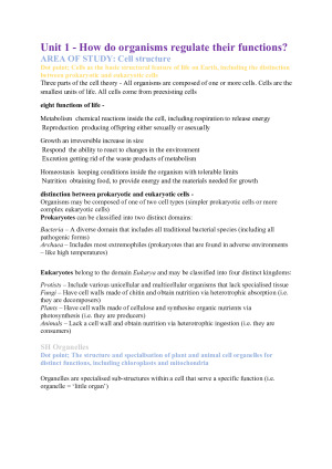 Unit 1: How do organisms regulate their functions? AREA OF STUDY: Cell structure AREA OF STUDY: Cell Development AREA OF STUDY: Cellular Systems Unit 2: How does inheritance impact on diversity? AREA OF STUDY: System Feedback AREA OF STUDY: Heredity AREA OF STUDY: Inheritance AREA OF STUDY: Reproduction AREA OF STUDY: Biodiversity Unit 3: How do cells maintain life? AREA OF STUDY: Genetics AREA OF STUDY: Biotechnology AREA OF STUDY: Biochemical Pathways AREA OF STUDY: Photosynthesis AREA OF STUDY: Cell Respiration Unit 4: AREA OF STUDY: Nucleic Acids AREA OF STUDY: Immunity AREA OF STUDY: Epidemiology