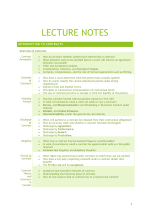 These are extensive notes from lectures and textbook readings covering weeks 1-13 of contract law: - Introduction to Contracts; Overview of Contract Remedies - Agreement - Offer and Acceptance - Consideration; Equitable Estoppel; Intention - Certainty and Completeness; Capacity; Requirement of Writing - Express Terms - Implied Terms; Construction of Terms; Exclusion Clauses - Misrepresentation; Misleading or Deceptive Conduct; Mistake - Duress; Undue Influence; Unconscionability - Discharge by Agreement; Discharge by Performance - Discharge by Breach; Discharge by Frustration - Illegality - Privity of Contract - Contract Theory and Context; Exam Preparation