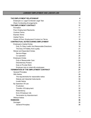 Extensive Notes on lecture and textbook content, covering week 1-12 topics and an exam scaffold answer template. Topics include: - Introduction and Sources of Employment Law - The Employment Relationship - The Employment Contract - Employee Duties - Mutual and Employer Duties - Termination of the Employment Contract - Remedies for Breach of the Employment Contract - Statutory Regulation - Unfair Dismissal - General Protections and Other Termination Rights - Industrial Action and Freedom of Association