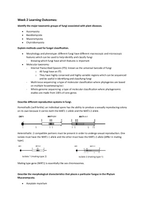 These notes contain each of the subjects learning outcomes covered from each of the lecture topics: - Principles of plant pathology - postharvest diseases - the fungi - basidiomycota - ascomycota - fungal taxonomy - viruses - bacteria - plant pathogenic nematodes - plant pathogen diagnosis - pseudofungi - Colletotrichum species - biosecurity - variation in plant pathogen populations - infection and parthogenesis - epidemiology - disease manage,ent