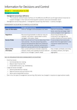 Comprehensive but concise IDC notes covering all topics needed for the final exam. I used subheadings and colour-coding to divide the material in a really clear and understandable way (especially helpful in the final exam when trying to locate a specific piece of info). These notes cover all topics (1-10): 1. Introduction to IDC 2. Fundamentals of Performance Measurement 3. Financial and Non-financial Performance Measurement 4. Strategic Performance Measurement Systems 5. Planning and Motivation 6. Performance Evaluation & Motivation 7. Making better decisions 8. Information Systems and Control 9. Digitalisation and Management Accounting 10. Tableau