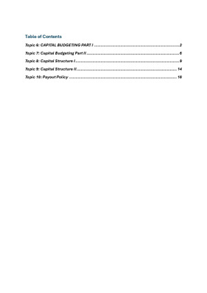 A comprehensive condensed and aesthetically pleasing notes, that can be printed off to take into an exam, containing all content from lectures. These notes helped me in securing 93% in this unit. Topics Include: Topic 6: CAPITAL BUDGETING PART I Topic 7: Capital Budgeting Part II Topic 8: Capital Structure I Topic 9: Capital Structure II Topic 10: Payout Policy