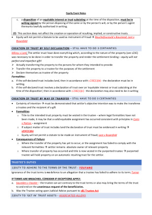 A full set of exam notes for equity and trust that includes scaffolded responses, and flowcharts for ease and efficient reference during the exam. Comprehensive principles outlined - nothing missing. A distilled version of lecture notes but everything relevant is contained in the notes. Topics covered; - Fiduciary duties - Equitable remedies (flowchart included) - Equitable bars to relief (flowchart included) - Assignment (flowchart included) - Trust (formality requirements to form a valid trust) - Trustee duties - Trustee's rights and liabilities - Breach of trust (flowchart included) - Beneficiary rights, powers and remedies - Priority disputes (visual aids included) - Tracing (visual aids included) - Resulting and constructive trust scaffold response (flowcharts included)