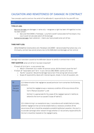 Comprehensive summary notes for all lecture and unit of study content from LAWS1017, including summaries of all cases and relevant legislation. Perfect study material for the mid-semester and final exams. Scored a HD with these notes Topics include: 1) Introduction to Torts & Contracts II; 2) Causation and Remoteness of Damage in Contract; 3) Damages in Contract and Recovery of Sums Fixed by the Contract; 4) Introduction to Vitiating Factors and the Remedy of Rescission; 5) Undue Influence, Unconscionable Contracts and Unfair Contract Terms; 6) Mistake; 7) Misrepresentation / Misleading or Deceptive Conduct; 8) Trespass to Land; 9) Private Nuisance; 10) Tort Liability for Interference with Goods; 11) Tort of Deceit; 12) Pure Economic Loss From Negligence; 13) Pure Economic Loss From Negligence Arising From Damage To Third Party Property & Pure Economic Loss From Negligence Arising From Injury To Third Parties; 14) Pure Economic Loss From Defective Structures and Products; 15) Multiple Wrongdoers.