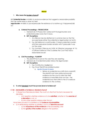 Evidence summary notes and scaffolds used to learn the content. Obtained 85 (HD) in the exam. Topics covered: - Introduction to Evidence Law - Proof I (Burdens and Standards) - Adducing Evidence (Witnesses, Documents and Real Evidence) - Relevance - Hearsay - Admissions and Self-Incrimination - Credibility - Tendency and Coincidence Evidence - Character of the Accused - Opinion Evidence - Identification Evidence - Discretions - Proof II (Directions)