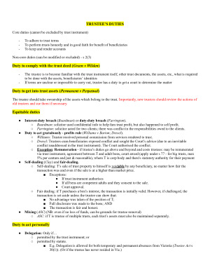 Extremely comprehensive but succinct notes for use in revision and during the exam, including the following topics/headings: - GENERAL PRINCIPLES - CLASSIFYING A TRUST - THE THREE CERTAINTIES - CONSTITUTION - STATUTORY WRITING FORMALITIES - QUISTCLOSE TRUSTS - CHARITABLE TRUSTS - TRUSTEE’S DUTIES - DEFENCES - TRUSTEE’S RIGHTS - RIGHTS OF BENEFICIARIES - REMEDIES