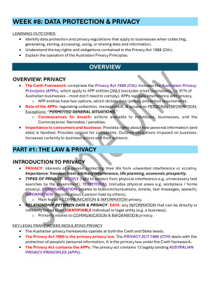 BTC1110 requires clearly organised information so that it can be accessed with ease during assessments, and so that the relevant content becomes apparent when looking at new questions. This is the approach off of which these notes are based. The notes are detailed, as well as relevant and specific to the course. The understanding is clearly outlined as a result of questioning TAs and searching the Internet for concise explanations so that you won't need to do the searching yourself. The wording aligns with what the unit has taught is correct exam practice. The topics covered in each week are: 1. Introduction to the Law, Australian Legal System, and Legal Ethics. 2. Contract Law #1 3. Contract Law #2 4. Contract Law #3 5. Contract Law #4 6. Consumer Protection #1 7. Consumer Protection #2 8. Privacy 9. Torts (Negligence) #1 10. Torts (Negligence) #2 11. Business Organisations #1 12. Business Organisations #2