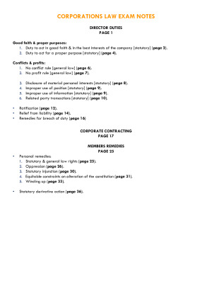 High Distinction exam notes 2023. Covers all topics and is in attack-plan form. Refer to sample page for topic break down. DIRECTOR DUTIES Good faith & proper purposes: 1. Duty to act in good faith & in the best interests of the company [statutory] (page 2). 2. Duty to act for a proper purpose [statutory] (page 4). Conflicts & profits: 1. No conflict rule [general law] (page 6). 2. No profit rule [general law] (page 7). 3. Disclosure of material personal interests [statutory] (page 8). 4. Improper use of position [statutory] (page 9). 5. Improper use of information [statutory] (page 9). 6. Related party transactions [statutory] (page 10). • Ratification (page 12). • Relief from liability (page 14). • Remedies for breach of duty (page 16) CORPORATE CONTRACTING PAGE 17 MEMBERS REMEDIES PAGE 25 • Personal remedies: 1. Statutory & general law rights (page 25). 2. Oppression (page 26). 3. Statutory injunction (page 30). 4. Equitable constraints on alteration of the constitution (page 31). 5. Winding up (page 33). • Statutory derivative action (page 36).