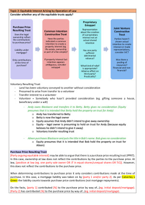 These notes include structured answers and case summaries for topic 1 (co-ownership) & topic 2 (equitable interests) and should act as a guide when answering questions in the mid-semester/in class test. Topics Covered: - Topic 1: Co-ownership - Topic 2: Equitable interests arising by operation of law