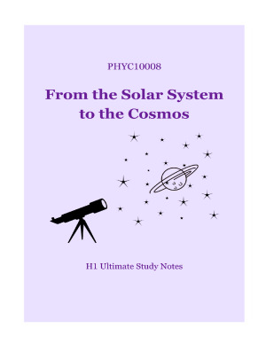 From the Solar System to the Cosmos complete notes Guide to an H1 in PHYC10008!!!!! Topics Include: - History of the universe - Kepler's Laws - The solar system - Solar system formation - Terrestrial planets - Jovian planets - Light - Telescopes - Special relativity - General relativity - The sun - Stellar properties - Star formation - Life cycle of stars - Stellar graveyard - Milky Way and other galaxies - Galaxy evolution - Black holes - Distances - Dark matter - Big bang universe - Expanding universe - Dark energy - Fate of the universe - Life in space - Life on exoplanets