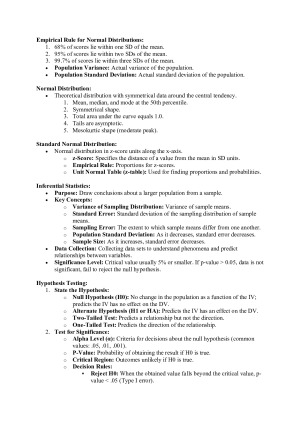 This comprehensive study booklet is your essential guide for acing the final exam! It's packed with everything you need, covering all lecture content and Stata syntax in a clear, condensed format. Topics include: Background Theory Correlations Measures of Central Tendency Variability Normal Distribution Measures of Skewness Z-Score Interaction Power Non-Parametric Analyses Pearson’s Correlation Simple Linear Regression Multiple Regression Collinearity Tolerance One Sample T-Test Paired Samples T-Test Independent Samples T-Test One-Way ANOVA Multiple Comparisons Factorial ANOVA Multiple Comparisons Linear Contrasts Mann Whitney Wilcoxon Rank Sum Test Spearman’s Correlation Wilcoxon Sign Rank Test Kruskal Wallis Test Post Hoc Comparison: Dunn Test Chi Square Test of Independence Adjusted Residuals This booklet is designed to be your go-to resource, ensuring you have all the knowledge you need to succeed. Make it your study bible and tackle your final exam with confidence!