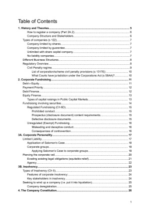 These notes provide a comprehensive and structured breakdown of Corporations Law, outlining all relevant case law, legislation, and succinct topic scaffolds that outline key principles and will prove invaluable in timed exam conditions. Cases outline: - Facts; - Issues; - Principles; and - Reasoning ✓ Comprehensive ✓ Structured ✓ Colour-coded ✓ Scaffolds Topics: 1. History and Theories 2. Corporate Fundraising 3A. Corporate Personality 3B. Insolvency 4. The Company Constitution 5. Company meetings 6. Corporate Contractual Liability 7. Corporate Attribution and Liability (tort, criminal) 8. Directors’ Duties 9. Insolvent trading (s 588G) 10. Members’ rights and remedies