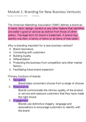 Full notes for weeks 1 - 11 of Branding and Promoting New Business Ventures Complete Notes, Trimester 3 2023 Includes depth of information including definitions, statistics, graphs Colour coded, consistent sizing and font, easy to read and understand Topics include - Branding - Small Businesses - Consumers - Organisational Culture - Networking - PR and Publicity