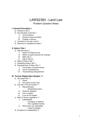 These notes absolutely carried me through the land law exam. I worked on these notes constantly throughout the term and they are so thorough and easy to follow! I have colour coded all cases and legislation and highlighted key phrases so that even though the notes are very detailed and comprehensive, they are still super easy to follow! I have outlined steps showing how to complete problem questions and I have an essay notes section at the end that goes through key essay content for the final exam! I even have tables in the essay notes with arguments for both sides so that you can create sophisticated arguments and counterarguments in your essays. All topics have been covered - I did every reading so every bit of course content is in here!