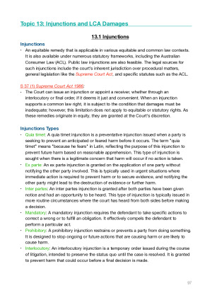These notes are your ultimate guide to mastering the subject of 'Remedies.' They comprehensively cover every examinable topic and are designed to support you through all assessments, including assignments and take-home exams. With a meticulous yet accessible approach, these notes provide a step-by-step method for tackling exam questions, making complex material easy to navigate. Each section concludes with a summary of key cases relevant to the topic, ensuring you have a clear grasp of important legal precedents. In addition, the content is tailored to help you formulate insightful responses during class discussions, making these notes an invaluable resource for both exam preparation and active participation. TOPICS COVERED INCLUDE - GENERAL PRINCIPALS OF COMPENSATION - REVISING COMPENSATION FOR BREACH OF CONTRACT - COMPENSATION FOR PERSONAL INJURY - COMPENSATION FOR PROPERTY AND PURE ECONOMIC LOSS - COMPENSATION IN EQUITY - MITIGATION, CONTRIBUTORY FAULT, DATE OF ASSESSMENT - PROPORTIONATE LIABILITY - COMPENSATION FOR MISLEADING AND DECEPTIVE CONDUCT - EXEMPLARY DAMAGES - GAINS-BASED AWARDS - SPECIFIC PERFORMANCE - INJUNCTIONS AND LCA DAMAGES