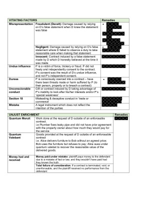 VITIATING FACTORS: - Misrepresentation: Fraudulent (Deceit), Innocent and Negligent - Undue influence - Duress - Unconscionable conduct - s 18 - Mistake UNJUST ENRICHMENT - Quantum Meruit - Quantum Valebat - Money had and received: Money paid under mistake & total failure of consideration BREACH OF CONTRACT - Remedies at law - Remedies in equity LAND - Trespass to land - Property damage