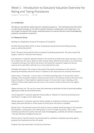 Full notes for weeks 1-10 - topics include - Intro to Statutory Valuation - Stat Val for Taxing Purposes - Statistics and Sales Analysis - AVMs - Valuation for Court Processings - Land Acquisition and Compensation - Compulsory Acquisition - Legislation, Regulation, and Codes of Conduct - Valuation Standards - Future of Property Valuation