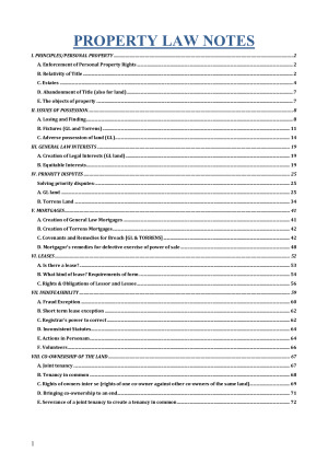 I. PRINCIPLES/PERSONAL PROPERTY 2 A. Enforcement of Personal Property Rights 2 B. Relativity of Title 2 C. Estates 4 D. Abandonment of Title (also for land) 7 E. The objects of property 7 II. ISSUES OF POSSESSION 8 A. Losing and Finding 8 B. Fixtures (GL and Torrens) 11 C. Adverse possession of land (GL) 14 III. GENERAL LAW INTERESTS 19 A. Creation of Legal Interests (GL land) 19 B. Equitable Interests 19 IV. PRIORITY DISPUTES 25 Solving priority disputes: 25 A. GL land 25 B. Torrens Land 34 V. MORTGAGES 41 A. Creation of General Law Mortgages 41 B. Creation of Torrens Mortgages 42 C. Covenants and Remedies for Breach [GL & TORRENS] 42 D. Mortgagor's remedies for defective exercise of power of sale 48 VI. LEASES 52 A. Is there a lease? 53 B. What kind of lease? Requirements of form 54 C. Rights & Obligations of Lessor and Lessee 56 VII. INDEFEASIBILITY 59 A. Fraud Exception 60 B. Short term lease exception 62 C. Registrar’s power to correct 62 D. Inconsistent Statutes 64 E. Actions in Personam 64 F. Volunteers 66 VIII. CO-OWNERSHIP OF THE LAND 67 A. Joint tenancy 67 B. Tenancy in common 68 C. Rights of owners inter se (rights of one co-owner against other co-owners of the same land) 69 D. Bringing co-ownership to an end 71 E. Severance of a joint tenancy to create a tenancy in common 72