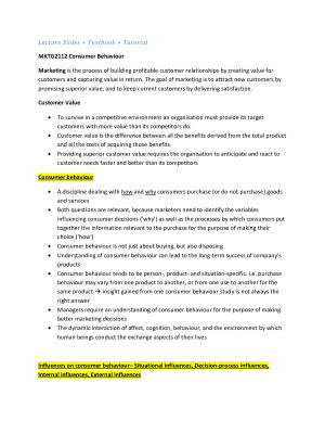 Comprehensive and well-organised note based on lectures, tutorials and textbook. Materials covered only for mid term examination (W1 - W4). As marketing senior subjects require more depth and knowledge, I have read the whole textbook and went all the lectures and tutorials, and combined them all in this note in a simple and clear manner. A lot of diagrams and examples included to help you understand various marketing terms. It manages all the important parts in the textbook so you don't necessarily need to purchase or read the textbook separately. I can guarantee that you will never regret the purchase and can also easily get HD with this note. All my colleagues used my note and got at least Distinction :) I have posted quite cheap considering the length of the note and all my effort and time spent on this note. Wish you all the best and hope you guys all get HDs with my note. The content of the notes are as follows: W1 Introduction to Consumer Behaviour W2 Decision Process 1 W3 Decision Process 2 W4 Decision Process 3 If you are satisfied with this note, please consider the purchase of the note covering W5-W13 (final exam prep) uploaded.