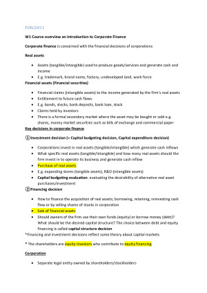 Comprehensive and well-organised note based on lectures, tutorials and textbook. Materials covered for W1~W7 as from W8, most of the contents are theories which you can easily understand by only looking at the lecture slides. Note consists of 75 pages and is very detailed. I can guarantee that you will never regret the purchase and can also easily get HD with this note. All my colleagues used my note and got at least Distinction :) I have posted quite cheap considering the length of the note and all my effort and time spent on this note. Wish you all the best and hope you guys all get HDs with my note. The contents are as follow: W1 Course overview an Introduction to Corporate Finance W2 A modern financial system W3 Basic financial mathematics and valuation W4 Valuing bonds W5 Valuation of shares W6 Capital Budgeting – 1 (Net Present Value and Other Investment Criteria) W7 Capital Budgeting 2 (Making investment decisions with NPV rule)
