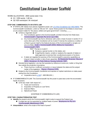 These notes contain lecture and reading materials pertinent to answering a hypothetical question. Topics include: - Overview - Trade and Commerce Power s 51(i) - Acquisition of Property on Just Terms s 51(xxxi) - External Affairs s 51(xxix) - Nationhood Power s 51(xxxix)