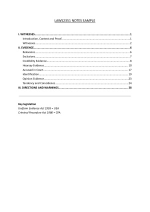 I recieved a HD in the final exam using these notes. They are comprehensive (see table of contents), include a myriad of cases and all legislation points (UEA and CPA) and are in an efficient, colour coded, in-depth checklist format. They are also formatted in such a way that includes pre written statements that can be tweaked and used in the exam, and include some self-made charts where necessary to link between topics (useful in a complex problem question and areas such as hearsay). I hope they help!! :)