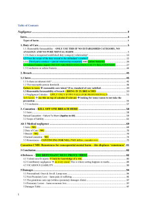 Got 87% relying on these notes - covers entire course. Topics include: Negligence ....................................................................................................................... 3 Intro ........................................................................................................................................ 4 Types of 5 1. Duty of Care ........................................................................................................................ 5 Reasonable foreseeability – ONLY USE THIS IF NO ESTABLISHED CATEGORY, NO ANALOGY AND NO PURE MENTAL HARM ....................................................................................... 5 Is there a recognised established duty (category) relationship? ............................................................. 13 Does the scope of the duty extend to the defendant’s conduct? ............................................................. 15 (Third party conduct – special relationship exception) AND (salient features) .................................. 26 Salient Features inquiry (NO ESTABLISHED/ANALOGOUS DUTY RELATIONSHIP) ................. 27 Conclusion on salient features ............................................................................................................... 44 2. Breach ............................................................................................................................... 45 Intro ................................................................................................................................ 45 Is there an inherent risk? ........................................................................................................................ 45 The reasonable person threshold ............................................................................................................ 46 Failure to warn reasonable care taken? If so, standard of care satisfied. ........................................ 49 Reasonable foreseeability of breach – BRING IN 2X BREACHES ................................................ 50 Negligence Calculus – APPLY ONLY IF PPO FAILS (FOR PROFESSIONALS) ............................. 51 Soft factors use this on top of calculus if relevant looking for some reason to not take the precaution ................................................................................................................................................... 55 Conclusion ............................................................................................................................................. 57 3. Causation – KILL OFF ONE BREACH HERE ................................................................ 58 Intro ........................................................................................................................................................ 58 Factual Causation – Failure To Warn (Applies to All) .................................................................................. 59 Scope of liability .................................................................................................................................... 61 Alt 3 Medical negligence ....................................................................................................... 69 1 Intro - MG ................................................................................................................................................ 69 2 Duty of Care - MG ................................................................................................................................... 70 3 Breach - MG ............................................................................................................................................. 70 4 Factual causation - MG ............................................................................................................................ 74 Remoteness – CONTINUING FOR NEG, PMH differs, consider 75 Causation CMH: Remoteness for consequential mental harm – this displaces ‘remoteness’ . 81 3 Conclusion .......................................................................................................................... 82 4 Defences – THE DEFENDANT MUST PROVE THESE .................................................... 82 Volenti non-fit injuria look for knowledge of a risk ....................................................................... 82 Contributory negligence on every exam! This is where sorting happens re marks. .......................... 84 VICARIOUS LIABILITY ..................................................................................................................... 90 5 Damages ............................................................................................................................. 94 Personalised. Once & for all. Lump sum. .............................................................................................. 94 Non-Pecuniary Loss – harm pain or suffering ....................................................................................... 95 The gratuitous care cap (within a pecuniary damages claim) ................................................................ 97 Pecuniary Losses – harm economic loss ................................................................................................ 97 5 Damages Table ......................................................................................................................................... 97 2 6 Conclusion ................................................................................................................... 101 Trespass to 101 E1 - Direct or indirect interference? ...................................................................................................... 101 E3 - Trespass protects possession (not merely occupation) .................................................................. 103 E4 - Ha