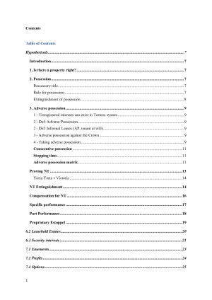 Complete semester hypo notes for property - covers all topics. Below is table of contents: Hypotheticals .......................................................................................................................................... 7 Introduction ....................................................................................................................................... 7 1. Is there a property right? ............................................................................................................. 7 2. Possession ....................................................................................................................................... 7 Possessory title ................................................................................................................................ 7 Rule for possession ......................................................................................................................... 7 Extinguishment of possession ......................................................................................................... 8 3. Adverse possession ........................................................................................................................ 9 1 – Unregistered interests can exist in Torrens system ................................................................... 9 2 - Def: Adverse 9 2 - Def: Informal Leases (AP, tenant at will) .................................................................................. 9 3 - Adverse possession against the Crown ...................................................................................... 9 4 - Taking adverse possession ......................................................................................................... 9 Consecutive possession ............................................................................................................... 11 Stopping time ............................................................................................................................... 11 Adverse possession 11 Proving NT ...................................................................................................................................... 13 Yorta Yorta v Victoria .................................................................................................................. 14 NT Extinguishment ......................................................................................................................... 14 Compensation for NT ..................................................................................................................... 16 Specific performance ...................................................................................................................... 17 Part Performance ............................................................................................................................ 18 Proprietary Estoppel ...................................................................................................................... 19 Leasehold Estates ........................................................................................................................... 20 Security interests ............................................................................................................................ 21 Easements ....................................................................................................................................... 23 Profits ............................................................................................................................................. 24 Options ............................................................................................................................................ 25 2 : Mining interests ............................................................................................................................ 25 Topic 1 .................................................................................................................................................. 26 What is Country? ...................................................................................................................... 26 What is land? ............................................................................................................................. 26 Definition of land – interp of legislation act s 38 .......................................................................... 26 What is Country? .......................................................................................................................... 26 What is property? ..................................................................................................................... 30 Requirements of 30 Rights in rem v rights in personam ............................................................................................... 31 Yanner v Eaton ............................................................................................................................. 31 Vic Park v Taylor - No property rights in a spectacle ................................................................... 31 Yanner v Eaton (1999) 201 CLR 351 .............................................................................................. 32 Victoria Park Racing and Recreational Grounds co Ltd v Taylor (1937) 58 CLR 479 ................. 36 King v David Allen & Sons, Billposting Ltd (1916) 2 AC 54 .......................................................... 39 Licenses ...................................................................................................................................... 41 Types of licenses ........................................................................................................................... 41 Licenses - King v David Allen ..................................