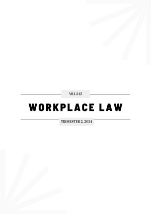 MLL342 Workplace Law notes for the exam. Notes taken in Trimester 2, 2024. Posted before the completion of the exam but received a Distinction on the assignment. Notes are taken from the study guide with the readings sprinkled in where there were gaps in knowledge. This will save you so much time going through study guides and readings so you can focus on attending seminars and lectures during the trimester! Detailed content page included with hyperlinks taking you directly to the page you need which is very helpful during exams. Legislation in orange and case law in red to help you identify sources. Topics included: Topic 1: Different types of work arrangements Topic 2: Minimum Standards Topic 3: Contract formation, content and interpretation Topic 4: Implied Duties Topic 5: OHS, bullying, and worker's compensation Topic 6: Termination of Employment Topic 7: Equal Opportunity and Discrimination Topic 8: Enterprise Agreements Topic 9: Freedom of association and industrial action