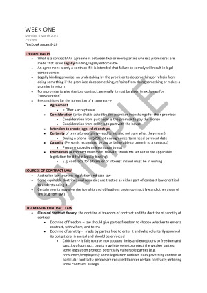 All topics covered - Week 1: Intro to contracts - Week 2: Acceptance - Week 3: Consideration - Week 4: Intention to create legal relations and certainty - Week 5: Capacity - Week 6: Formalities and estoppel - Week 7: Privity - Week 8: Express terms - Week 9: Implied terms - Week 10: Classification of terms
