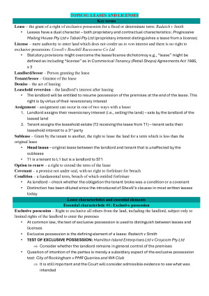 Simplified property law B notes TOPICS: - Leases & licenses - Covenants against the tenant - Covenants implied against the landlord - Assignment and subletting - Determination of leases - Landlord's remedies - Tenant's remedies - Securities and mortgages - Easements - Freehold covenants