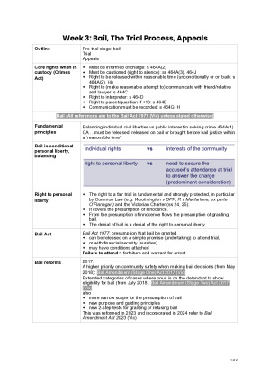 These comprehensive Criminal Law Exam Notes cover key principles and topics essential for understanding criminal liability and the criminal justice process. With content from 12 weeks of study, these notes provide a well-structured, concise overview of the main areas of criminal law, enabling students to build a strong foundation for exams and legal practice. Introduction to Criminal Law: An overview of the fundamental concepts of criminal law, including the nature of criminal responsibility, key legal principles, and the distinction between criminal and civil law. The Criminal Process: Investigation, Arrest, and Sentencing: Examining the stages of the criminal process from investigation through arrest to sentencing, with a focus on the procedural safeguards and the role of law enforcement. Bail, The Trial Process, Appeals: Understanding the law surrounding bail, the structure of the trial process, including the role of judges and juries, and the procedures for appealing convictions or sentences. Assault: Exploring the law of assault, including the elements of the offence, different types of assault, and the legal consequences of committing an assault. Murder: Analysing the crime of murder, focusing on the elements required to establish guilt, including intent, causation, and malice aforethought. Manslaughter: Examining the offence of manslaughter, distinguishing between voluntary and involuntary manslaughter, and understanding the defences and circumstances that may reduce a charge from murder to manslaughter. Sexual Offences: Discussing the legal framework surrounding sexual offences, including the definition of consent, the elements of offences like rape, and the statutory protections for victims. Defences: Exploring various defences available in criminal law, such as self-defence, provocation, duress, and insanity, and their application in different cases. Theft, Fraud, and Other Property Offences: Analyzing crimes related to property, including theft, fraud, burglary, and robbery, with a focus on the elements that must be proven for each offence. Attempts: Understanding the concept of attempt in criminal law, including the requirements for establishing criminal liability for attempted offences and the distinction between attempt and mere preparation. Complicity: Examining the principles of complicity and secondary liability, covering situations where individuals assist or encourage the commission of a crime and the legal consequences of being an accomplice. These notes are designed to provide students and legal professionals with a clear and comprehensive understanding of criminal law, enabling them to navigate the complexities of the criminal justice system and succeed in their studies or practice.