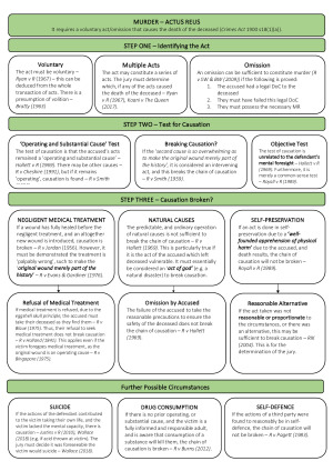 BENEFITS OF MY SCAFFOLDS - These scaffolds provide you with order, step-by-step and structure in how you approach problem questions - If you especially love mind maps or if you are a visual learner, you are going to love these scaffolds (see preview of my scaffolds) - It clearly sets out (1) definition of the offences/defences, (2) requirements of actus reus, (3) requirements of mens rea, (4) any other tests and requirements - **BONUS: Last 3 pages of the scaffolds are a proper scaffold that maps out the relationship and connection between all the different offences and defences - so helpful to give an OVERARCHING VIEW of all the topics - I have provided the name of the cases of each legal tests, rules, precedents - Hundreds of hours were spent on crafting this VERY CONCISE scaffold - helps with the TIME CONSTRAINTS during the exams - These scaffolds have been tested by a few other law students and all found it SUPER HELPFUL - Each topic is in different colour for easier review during revision and exam - Just have a look at the PREVIEW scaffold!! HOW TO USE THESE SCAFFOLDS? - Review the relevant topic scaffold to have a general yet comprehensive understanding of the topic before lecture - Criminal Law is a very content-heavy subject so these scaffolds are meant to be concise yet comprehensive - Use these scaffolds to answer tutorial questions, mid-semester assignment (problem question) - Make sure to familiarise yourself with the scaffold before exam - **BONUS: Last 3 pages of the scaffolds are a proper scaffold that maps out the relationship and connection between the different offences and defences - so helpful to give an OVERARCHING VIEW of all the topics MY GUARANTEE - This is going to be visually, the most helpful and especially if you are BEHIND the topics. These concise scaffolds provide a comprehensive overarching step-by-step approaches to all offences and defences. TOPICS - Homicide I: Murder - Homicide II: Unlawful and dangerous act manslaughter; gross negligence manslaughter - Assault, wounding and GBH offences - Sexual Offences - Larceny - Complicity - Extreme Provocation - Self-Defence - Duress and Necessity - Mental Health Impairment or Cognitive Impairment; and Substantial Impairment by Mental Health Impairment or Cognitive Impairment - Automatism (Involuntariness) - The use of evidence of (i) mental illness or (ii) self-induced intoxication to negate intent