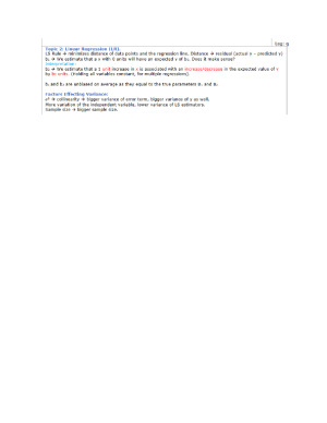 This is a single page of notes that can be used for the exam. Covers all topics (Week 1 to 12) and important information such as formula, relevant images and concepts. Topics are colour coded, so that information is found quickly. Covered topics are: Topic 1: Intro and Statistical Concepts Topic 2: Linear Regression Topic 3: Interval Estimation Topic 4: Prediction, Goodness of fit Topic 5: Multiple Regression Model Topic 6: F-test and Prediction Topic 7: Dummy Variables Topic 8: Omitting Important Explanatory Variables