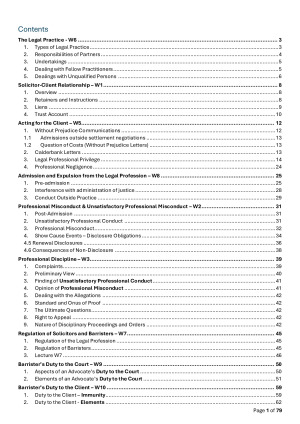 Bundle of notes consisting of 2 parts - Part 1: Concise notes - Part 2: Summaries of the Lectures Contents W1 - Solicitor-Client Relationship - Retainers and Instructions - Liens - Trust Account W2 - Professional Misconduct & Unsatisfactory Professional Misconduct - Post-Admission - Unsatisfactory Professional Conduct - Professional Misconduct - Show Cause Events - Disclosure Obligations - Renewal disclosures - Consequence of Non-disclosure W3 - Professional Discipline - Complaints - Preliminary View - Finding of Unsatisfactory Professional Conduct - Opinion of Professional Misconduct - Dealing with the Allegations - Standard and Onus of Proof - The Ultimate Questions - Right to Appeal - Nature of Disciplinary Proceedings and Orders W5 - Solicitor-Client Relationship - Without Prejudice Communications - Calderbank Letters - legal Professional Privilege - Professional Negligence W6 - The Legal Practice - Types of Legal Practice - Responsibilities of Partners - Undertaking - Dealing with Fellow Practitioners - Dealings with Unqualified Persons W7 - Regulation of Solicitors and Barristers - Regulation of the Legal Profession - Regulation of Barristers W8 - Admission and Expulsion from the Legal Profession - Pre-Admissions - Interference with administration of Justice - Conduct Outside Practice W9 - Barrister's Duty to the Court - Aspects of an Advocate's Duty to the Court - Elements of an Advocate's Duty to the Court W10 - Barrister's Duty to the Client - Duty to the Client - Immunity - Duty to the Client - Elements W11 - Barrister's Duty to Others - Duty to the Public, Other Parties, and Colleagues - Duty to the opponent - As a Prosecutor - Legal Aid commission W12 - Artificial Intelligence W13 - Overview / Summary