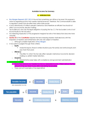 Succinct yet comprehensive tax law notes and essay scaffolds to learn the course and study for the exam. I used these notes and scored a HD and ranking for the subject. These notes contain detailed summary of cases, legislation and exam approaches for each topic. Topics: - Concept of Income - CGT -Income from Property -Taxation of Remuneration -Fringe Benefit Tax - Business Income -Compensation Receipts and Periodic Receipts -Deductions - Relevance -Deductions - Capital/Revenue Distinctions -Deductions - Trading Stock (Business Taxation) - Entity Taxation - Ethics