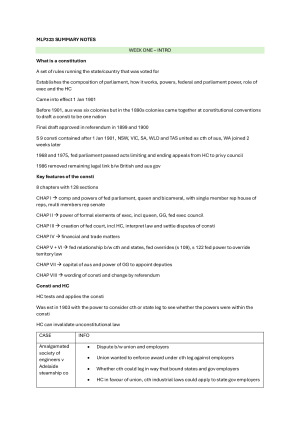 Topics: What is the constitution? Fundamentals of the constitution Separations of powers Federalism Parliament and Legislative Procedure (Cth + Vic) Qualification for Membership Standard v Alternative Legislative Procedure Characterisation (Financial Powers, External Affairs, Race Powers) Executive Inconsistency and Intergovernmental Immunities Constitutional Rights and Freedoms Boilermakers