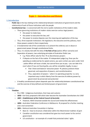 Comprehensive public law notes and scaffolds which are easy to read and follow. Learnt the course content and use these notes to study for the exam. - Key themes in Australian public law - Constitutional history: colonial origins and steps to independence - Constitutional change - 'The people' and the constitution - A representative parliament - A responsible executive - Non-statutory executive powers - Oversight of the Executive - Chapter III safeguards for judicial power