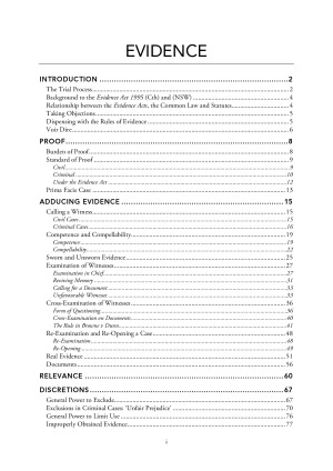 Evidence summary notes and scaffolds used to learn the content. Obtained 85 (HD) in the exam. Topics covered: - Introduction to Evidence Law - Proof I (Burdens and Standards) - Adducing Evidence (Witnesses, Documents and Real Evidence) - Relevance - Hearsay - Admissions and Self-Incrimination - Credibility - Tendency and Coincidence Evidence - Character of the Accused - Opinion Evidence - Identification Evidence - Discretions - Proof II (Directions)