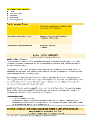 These notes include frameworks to answer questions including easy to follow and straightforward, succinct flow charts that directly take you through the answer for various topics. It also includes more detailed notes for the essay section. Topics covered are; > indefeasibility of title > Exceptions to indefeasibility incl; fraud, short term leases, volunteers, in personam, overriding statutes > Caveats > Co-ownership > Mortgages > Leases > Assignment of leases > Breach / remedies for breach of leases > Easements The Essay notes include comprehensive case summaries and in depth information for the purposes of drafting an essay in the exam.