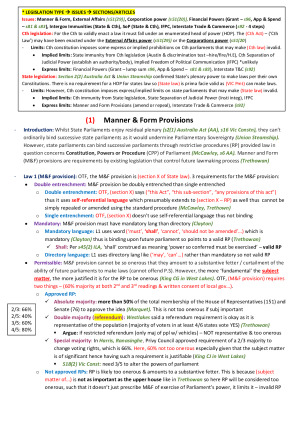 - Spent 250 hours + writing the notes and concise exam script (13k words). Has all relevant case summaries with structured steps in answering questions. - Organised into easy-to-navigate tables with subheadings, these notes provide brief case analogies for quick reference and real exam examples (in brackets) to help you correlate facts effortlessly. - Colour coded with examples for the final essay - Helped me get a HD in the unit - used these notes for the Assignment and final exam!! Topics include: Topic 2 State Power Topic 3 Manner and Form Topic 4 Cth Executive Power Validity of Executive Power under Prerogative Power Validity of Executive Action under Nationhood Power Validity of Executive Power Under Common Law Validity of Executive Power under Constitution Validity of Delegated Legislation Topic 5 Characterisation - Cth Legislative Power Topic 6 The External Affairs Power Topic 7 Corporations Power Topic 8 Spending Topic 9 Intergovernmental Immunities Topic 10 Separation of Powers Topic 11 Implied Political Freedoms Topic 11 Right to Vote Topic 12 Freedom of Interstate Trade and Commerce Topic 13 Inconsistencies