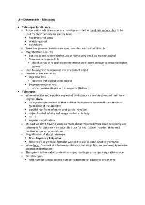 I easily got a H1 in this subject and with my notes you can too! My notes are easy to understand (with dot points and bolded sections that highlight important information). Covers all weeks (weeks 1-12) Topics covered: - Low Vision Epidemiology - Low vision exam P1 - Low vision exam P2 - Low vision aids P1: Magnification for near - High adds and Hand Mags - Low vision aids P2: Magnification for Near 2: Stand magnifiers - Distance aids - Telescopes - Low Vision and Technology - Low Vision Conditions: Peripheral - LV cases