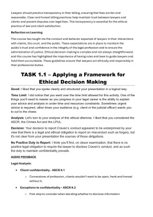 Ethics and Professional Responsibility Notes: Use them as a Headstart or to complement your Notes! Designed to help you navigate Ethics and Professional Responsibility, these notes can be used as a headstart to beginning the course. Key Features: Feedback Section: Detailed feedback sections outline common ethical considerations and strategies for effectively addressing them in practice. Reflection Section: A reflective section offers ideas for tackling complex ethical dilemmas, helping you develop professional judgment. Topic Coverage: TASK – Applying a Framework for Ethical Decision Making, TASK – Keeping Promises Made in Professional Practice, TASK 2 – Conflicts of Interest and Maintaining Client Confidentiality, TASK – Accounting for Other People Money, TASK – Accounting and Billing, TASK – Facilitating Access to Justice and TASK – Workplace Conduct. Why Choose This Guide? These notes are designed to be concise, easy to follow, and build upon. They can supplement your notes or give you a head start. Equip yourself with these notes to build a strong foundation of ethics and professional responsibility.