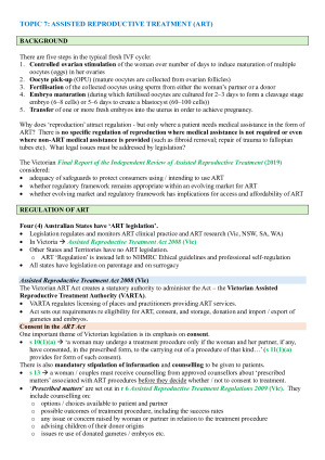 These exam notes helped me achieve a HD for this unit. They delve into the intricacies of biotechnology law in Australia, comprise a summary of the course, and are an excellent framework upon which you can structure your notes and write your exam answers in a comprehensive and precise manner. These notes include detail on all relevant examinable topics: - Clash of the Titans - Law vs Science - Mitochondrial Donation - Human embryos and biotechnology research - Genetic modification of humans - GMOs in the context of agriculture - Genetically modified food - Assisted Reproductive Treatment (ART) - Genetic testing of human embryos - Genetic information and resources All cases and relevant statutory provisions are colour-coded for your convenience. Best of luck studying LAW4193!